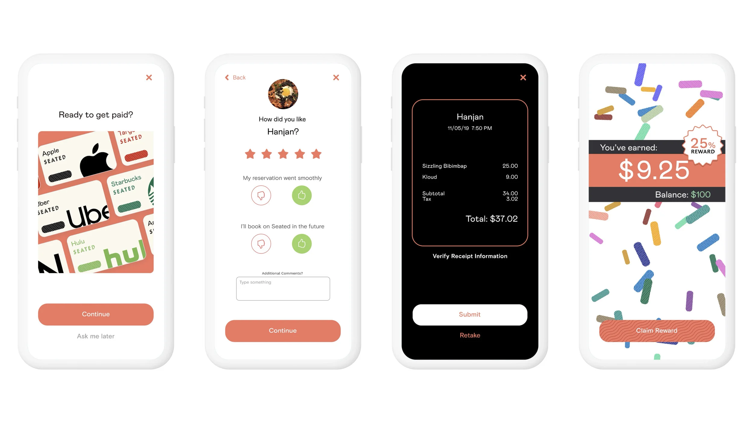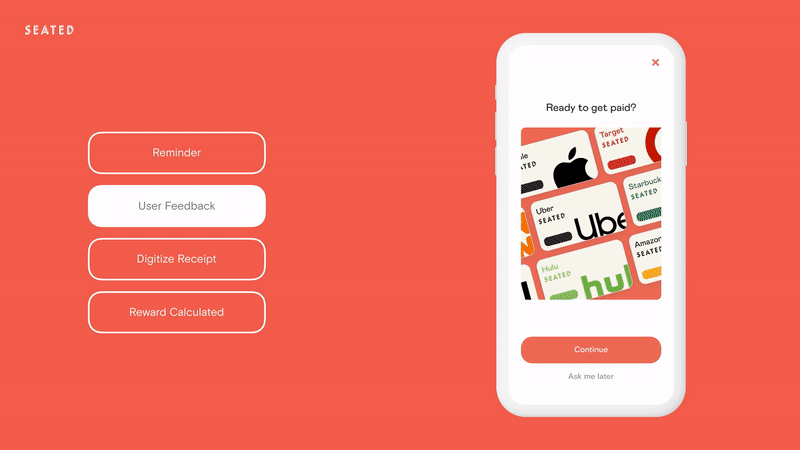 While working with my team to improve the UI of the Seated app, I took responsibility for rethinking the user-flow of the “rewards” sequence. This moment is defined by the actions required on the user’s side to ensure they receive the rewards from their finished dining experience. The original design lacked a sense of Seated branding. There was also a major pain point in the way receipts were photographed and submitted. The original app requires users to take a photo and submit it for review. These photographs are being reviewed by a support team manually. The user normally gets a text message 30 minutes later stating that their rewards have been received.